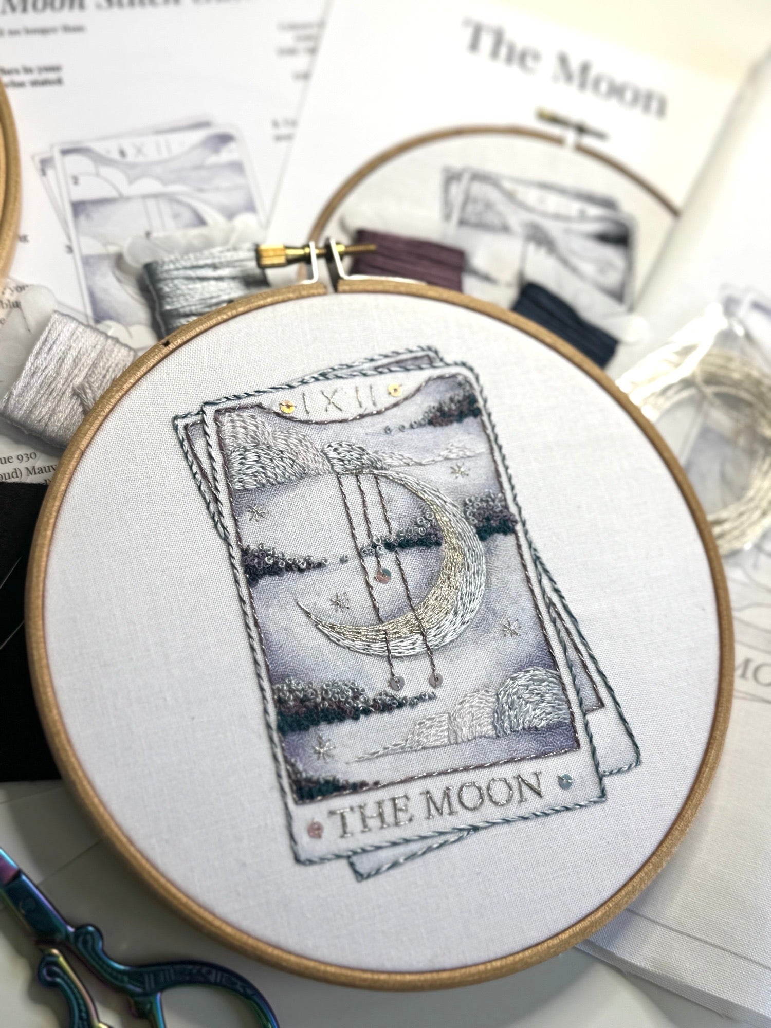 The Moon Tarot Card embroidery panel is perfect for those who already have materials at home. Including full stitch instruction booklet plus your initial printed on premium calico, and backing fabric, dive straight into your personalised embroidery design with the colours and embellishments of your choice giving you the freedom to let your creativity run wild!